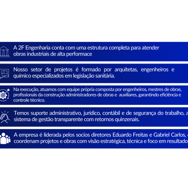A 2F Engenharia é uma empresa experiente e especializada em Vigilância Sanitária, oferecendo soluções técnicas e regulatórias que garantem segurança, conformidade e eficiência para empreendimentos de diversas áreas. Atuando com comprometimento e excelência, a 2F contribui diretamente para o crescimento econômico de seus clientes, auxiliando na adequação às exigências legais e na otimização de processos, promovendo competitividade e fortalecendo sua atuação no mercado.